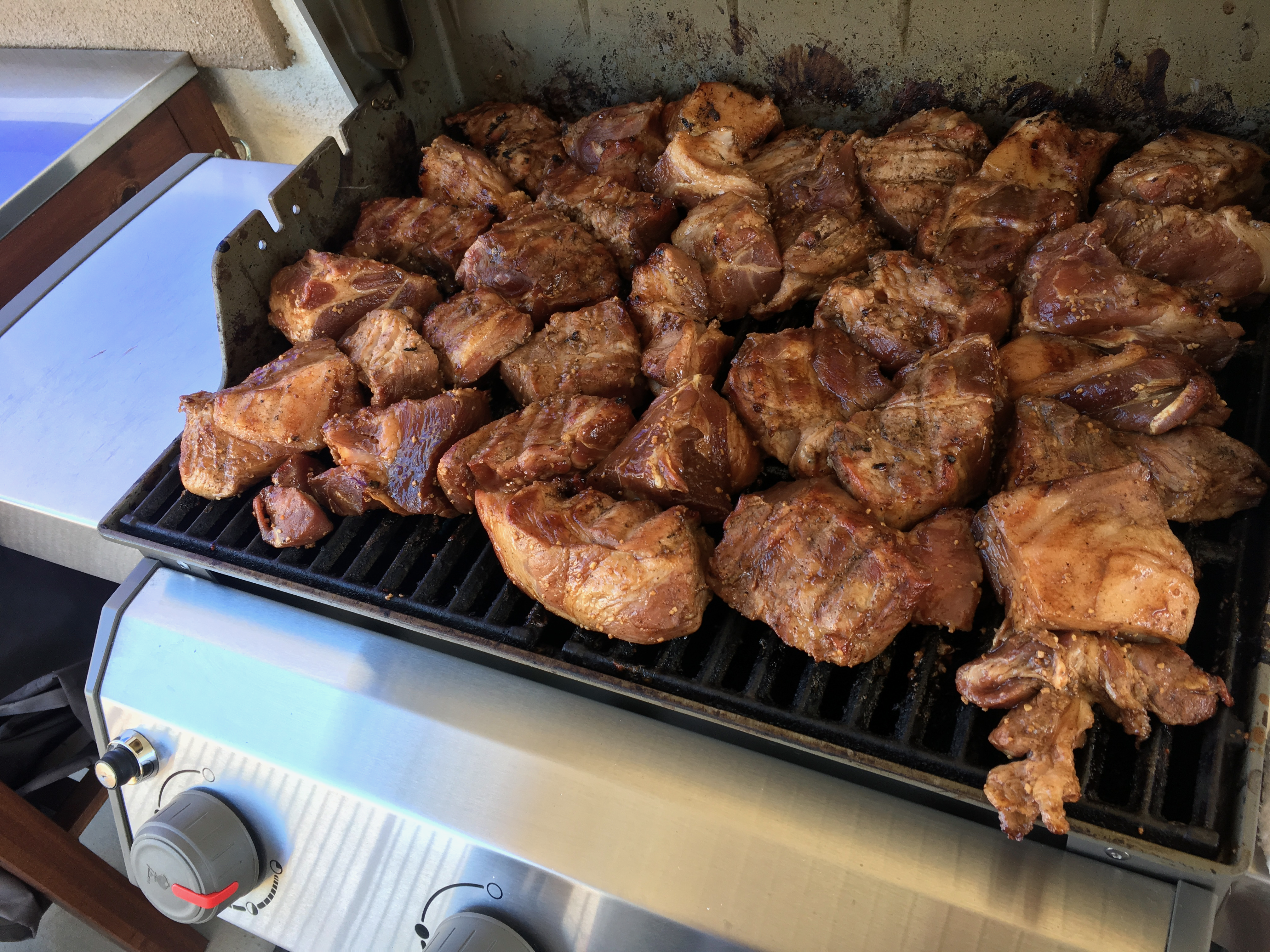 Preheat the gas grill. With all burners on low, arrange the pork on the grates. Close the lid, and cook for about 10 minutes.