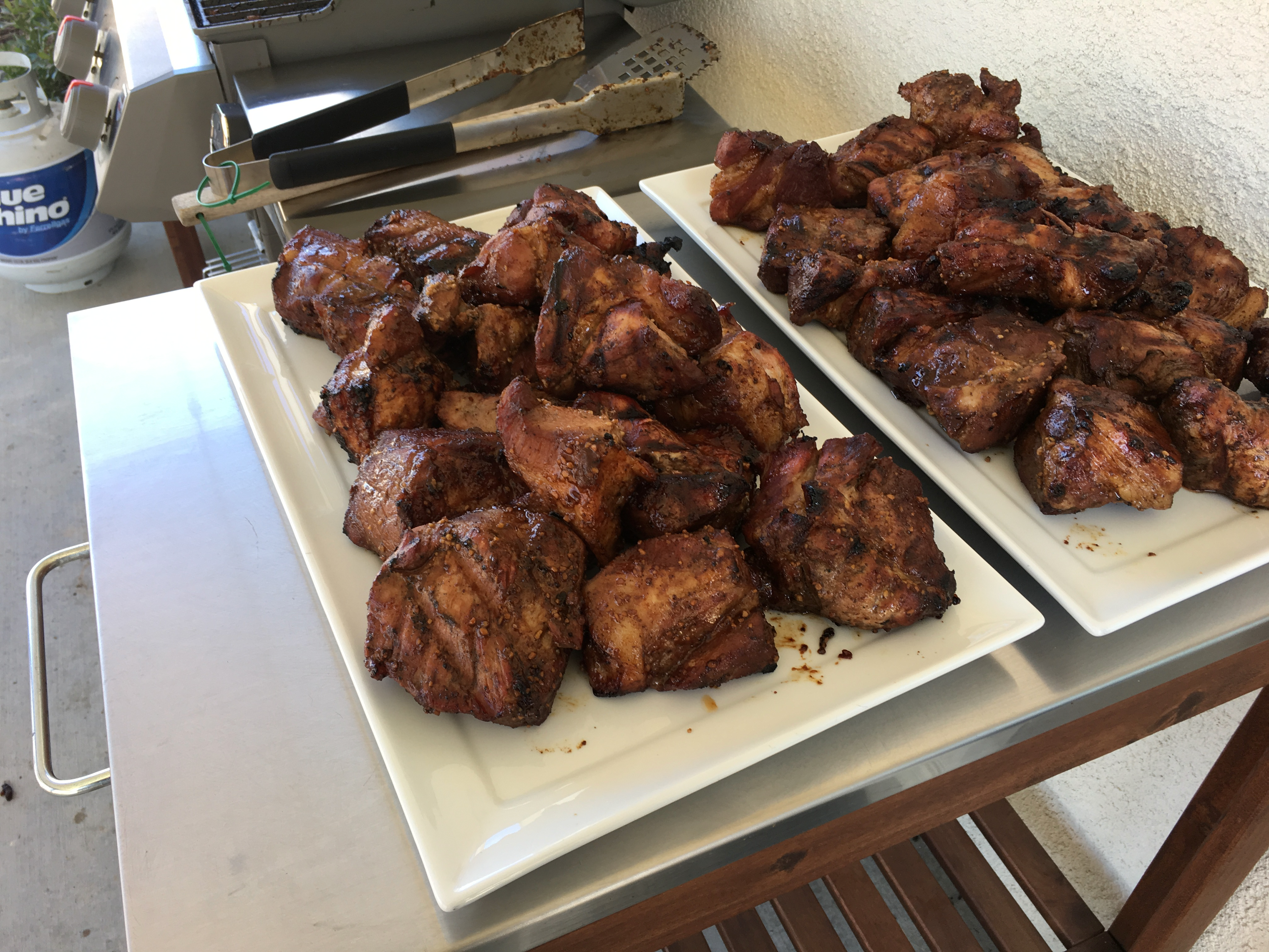 In a container large enough to hold the pork, mix all of the marinade ingredients. Mix in the pork, making sure to get all of the pieces covered. Cover and refrigerate overnight.