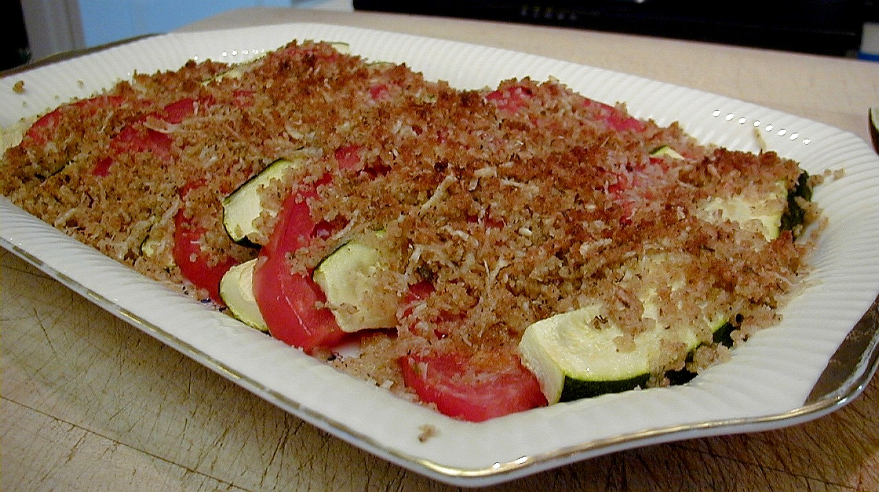 Lightly coat a shallow broiler-proof, microwave-safe casserole dish with olive oil. Arrange the zucchini and tomatoes in the casserole dish in alternating rows. Top with the bread crumb and cheese mixture. Cover and microwave to heat the tomatoes and zucchini through. Remove the lid and place under the broiler for about 5 minutes until the top just begins to brown.